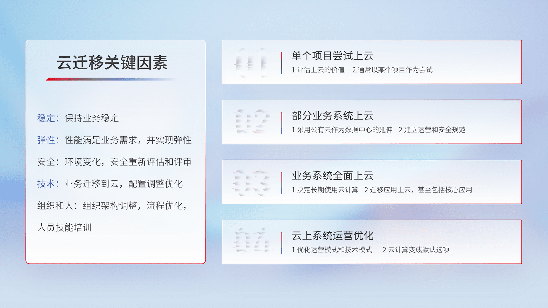 结合实际业务,,,从规划设计、、、、云平台选型、、、、云原生改造、、、、数据迁移、、、集成交付,,迁移全过程为客户识别最佳上云路径,,,,做好风险识别管理,,,设计网络架构、、、身份权限、、、安全审计合规、、操作审计、、日志审计、、监控告警策略、、多站点容灾设计等,,,对云上基础设施进行整体规划,,,提升IT治理水平,,以满足弹性、、、高可用、、、、高性能的需求。。