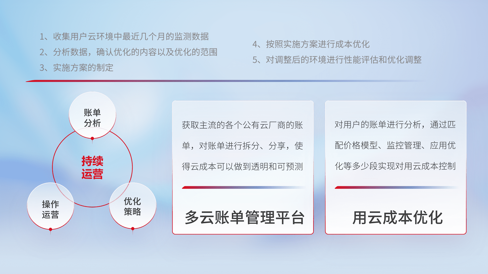 通过多云纳管,,,,以统一的资源数据模型把客户的云资源进行抽象和封装,,,进而实现对多云资源的统一操作,,保障云资源管理的可靠性、、、稳定性与可用性。。。量身定制化运维内容,,,,配置、、、、开发运维、、、补丁管理、、、备份、、监控、、、、认证和访问管理、、、审计和日常巡检等,,,,保障在用云过程中的可靠度,,,稳定度以及高可用率。。。