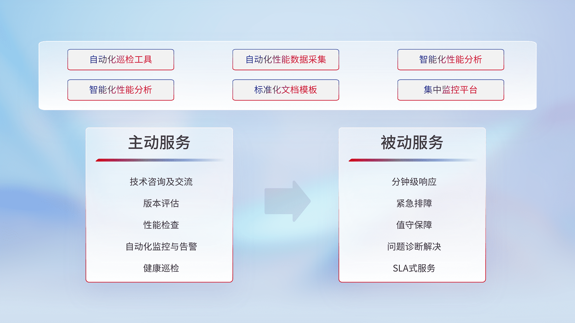 智能化工具和标准化文档,,,保障服务质量,,,,提供主动服务(包含技术咨询、、、、版本评估、、、性能检查、、自动化监控与告警、、、健康巡检)和被动服务包含(分钟级响应、、紧急排障、、值守保障、、问题诊断解决、、、SLA服务)。。。
